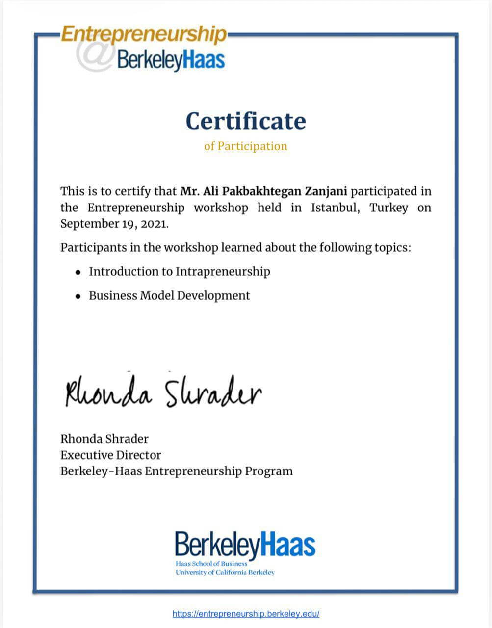 Participated in the Entrepreneurship and Business Management Workshop by UC Berkeley Haas School of Business (2021), focused on intrapreneurship and business model development.