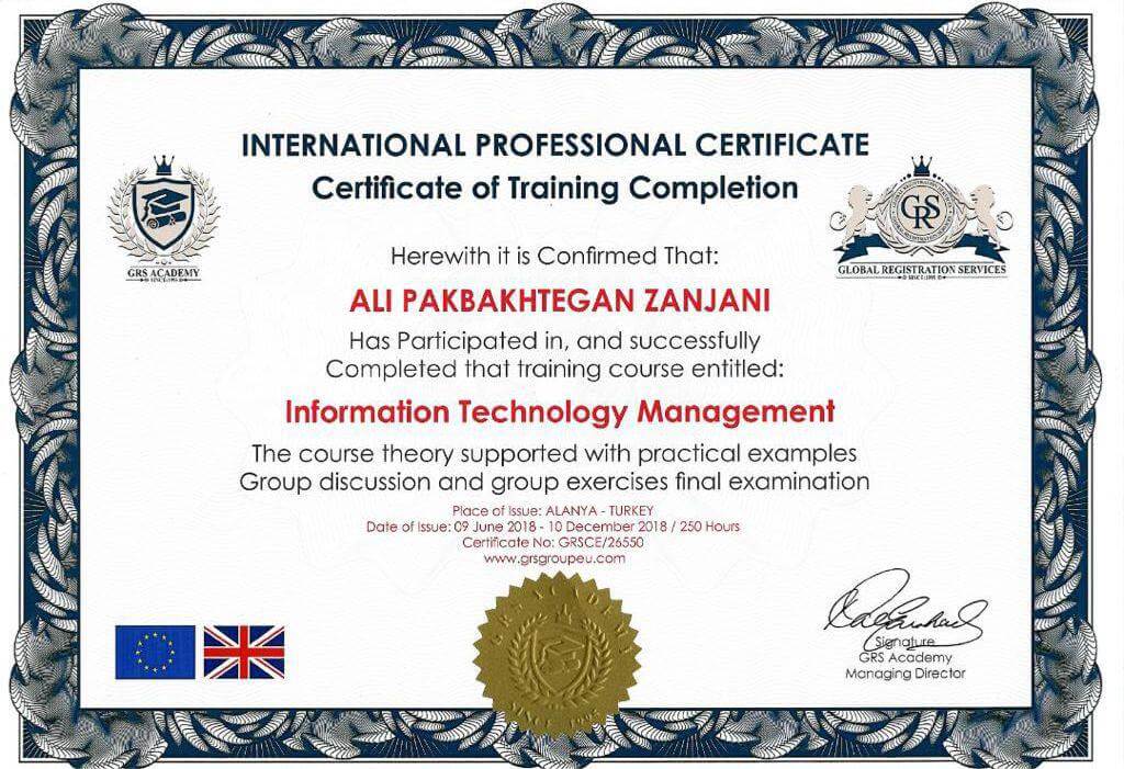 Certified in Information Technology Management by GRS Academy, London (2018). The program covered IT leadership, innovation strategy, and applied digital management practices.