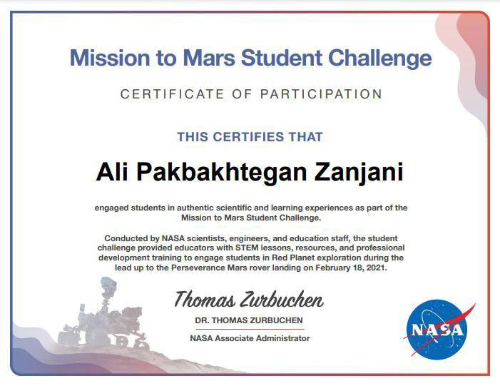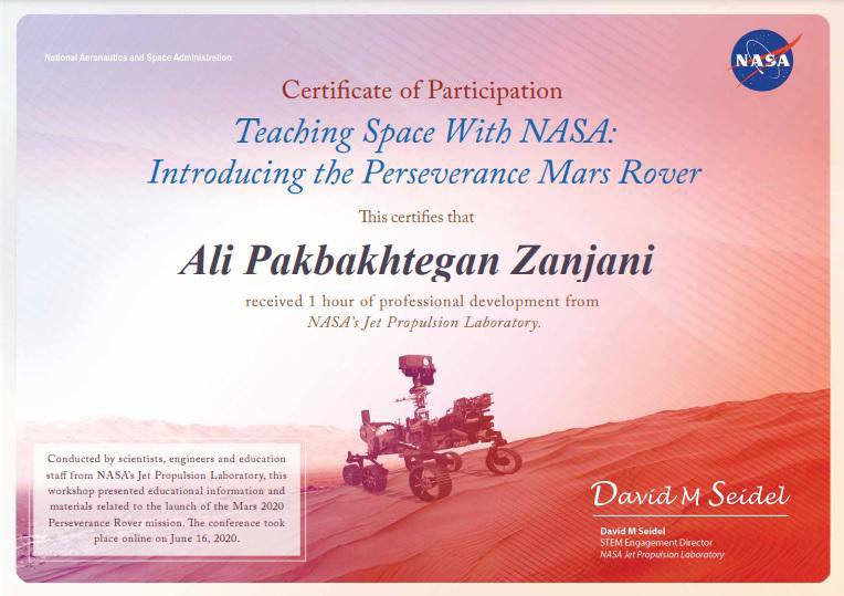 Completed a certified workshop with NASA’s Jet Propulsion Laboratory (2020), exploring the Mars 2020 mission and NASA’s STEM education programs. The course emphasized innovation in space science and planetary research.